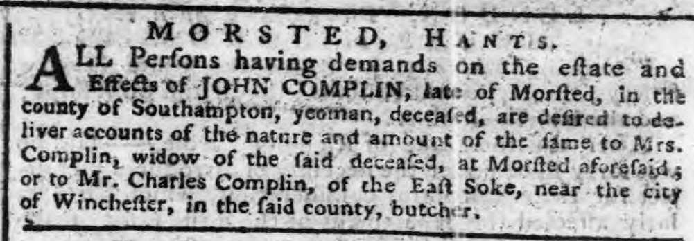 John Complin and Mary Dummer had ten children but only three of them were sons. Their eldest son John, who inherited the farm in Morestead, never married and had no children. Neither did their youngest son Charles. So it was left to their other son William to continue the family name. William, who lived from 1753 to 1825, spent his whole life in Morestead.