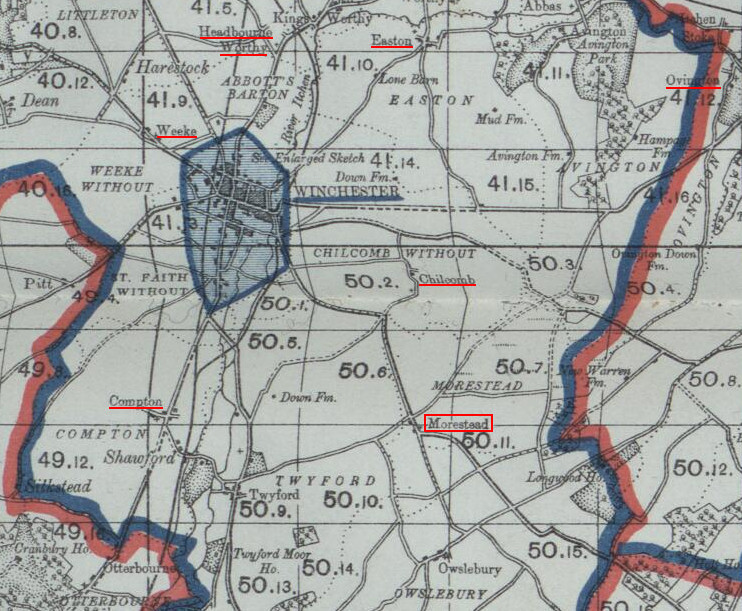 furthest south-west corner of the parish. Immediately south of the village, on a branch road leading to Owslebury, is Morestead Farm, south again of