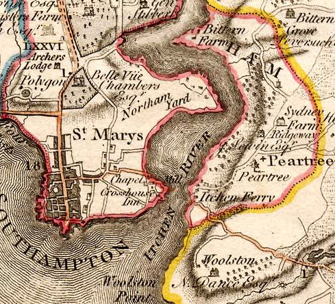 Itchen Ferry, shown in this map from 1791, was a waterside village situated near the mouth of the River Itchen. The name arose because it was