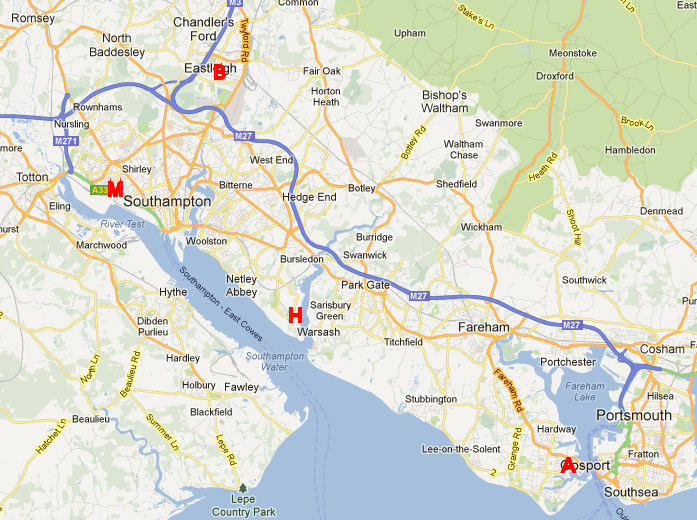 Alverstoke is marked with a red A, Millbrook with a red M, Hamble with a red H, and Bishopstoke, where John Slade eventually settled, with a red B.