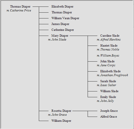 Mary was born at the end of 1790 or the beginning of 1791. When she and her sister Rosetta were young ladies they moved to Alverstoke near Gosport on the western shore of Portsmouth Harbour. (There were other Diapers in Alverstoke at the time who might well have been relatives.) Both girls got married in Alverstoke — Mary married John Slade, a shipwright who had been born in Millbrook, a village to the west of Southampton, and Rosetta married a man from Hamble called John Grace. Both couples then moved to Hamble to live. Mary and John Slade became great-grandparents of Sidney Parsons.