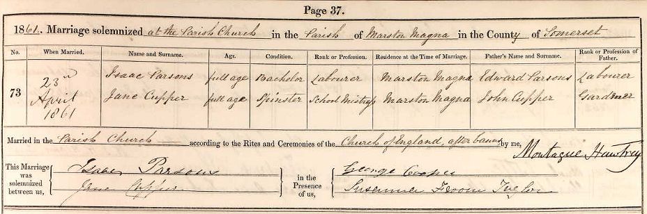 He was born in Marston Magna in South Somerset in the year 1835 and was baptised there on the 26th of March. His parents were Edward Parsons and his wife Elizabeth (née Taylor).