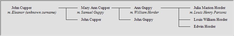 Also living in the guest-house was a girl called Julia Marion Horder who was Louis’s mother Jane’s great niece. (Julia’s grandmother, Mary Ann, was Louis’s mother’s eldest sister.) Julia’s mother Ann Guppy had, like Louis’s mother, originated in Marston Magna and had also come to Weymouth to work for Mrs. Cox, the lady for whom Louis’s mother was a lady’s maid.