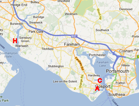 Clarence Yard in Gosport, and “A” marks Alverstoke, where the Royal Naval Hospital Haslar was located.