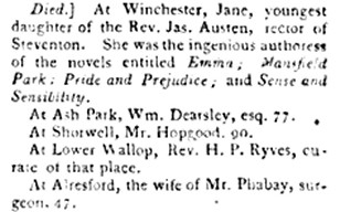 The announcement of Ann’s death in The New Monthly Magazine appeared a few lines below that of the author Jane Austin who had been