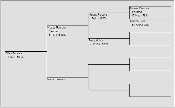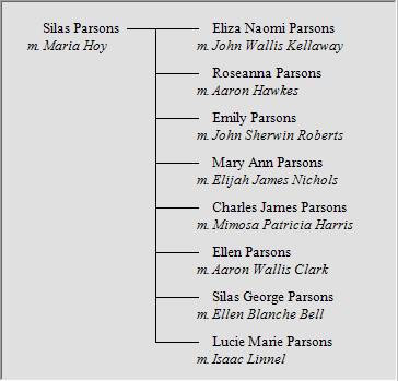 Sidney Alfred Parsons and his AncestorsSilas Parsons’ grandfather Moses Parsons was a brother of William Parsons of Holton, and William’s grandson Edward Parsons was a grandfather of Sidney Parsons who is the person upon whom the family tree described in these web pages is based. So Silas Parsons and Sidney Parsons were second cousins twice removed.